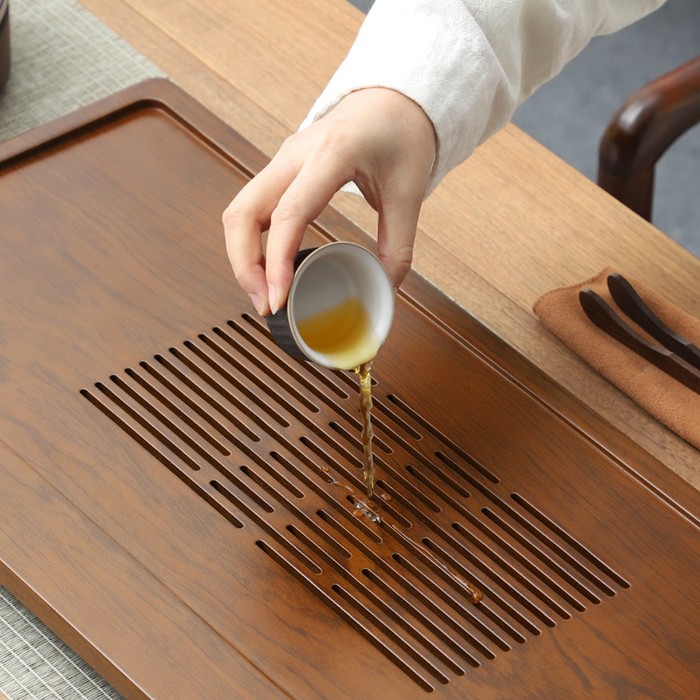 Поднос (чабань) - большая деревянная чайная доска для чайной церемонии. Этот изысканный предмет из натурального бамбука станет неотъемлемой частью вашего чайного ритуала. Прямоугольной формы и красивого дизайна, он подарит вам уют и комфорт во время чаепития. Поднос идеально подходит для сервировки чая. Вы можете удобно разместить на нем свои чайные принадлежности, а также поставить чашки и чайник. Доска имеет специальный поддон для слива воды, который предотвратит разлив чая на вашем столе.