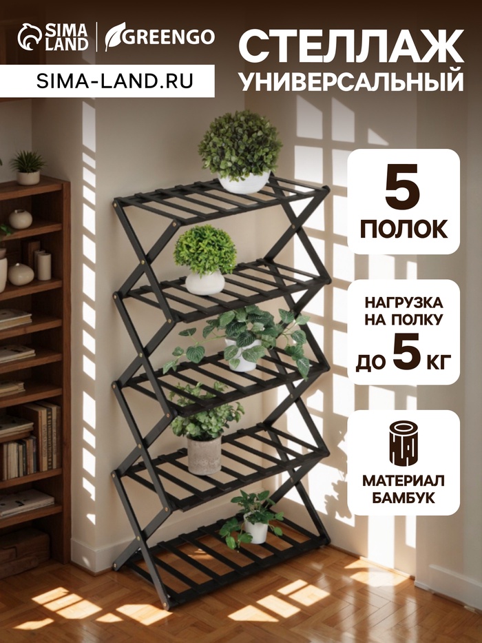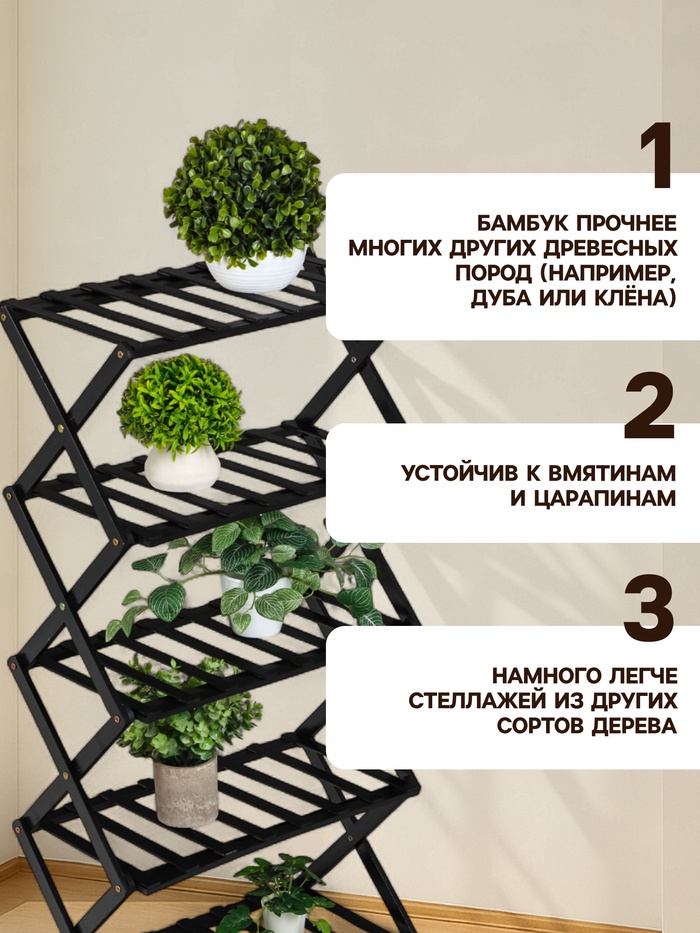 Эта подставка с пятью полками станет надёжным домом для ваших растений. Её размеры 50 × 25 × 89 см позволяют разместить множество цветов, создавая эффектный зелёный уголок. Бамбук, как экологически чистый материал, не только прочен, но и устойчив к внешним воздействиям, что делает подставку долговечным решением для вашего интерьера.