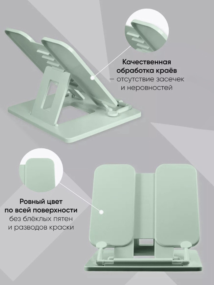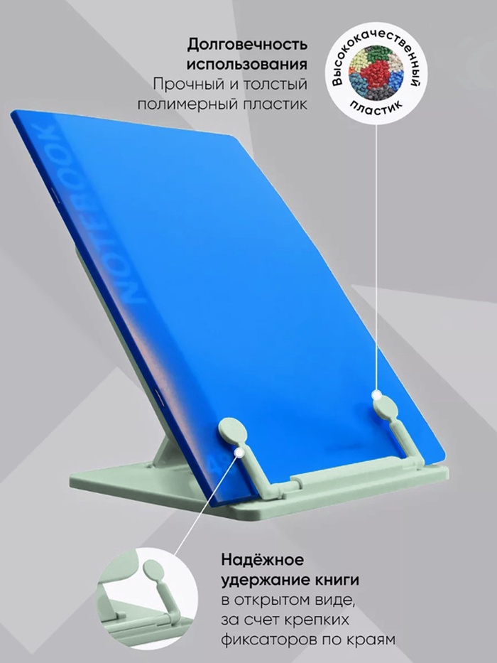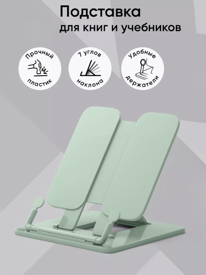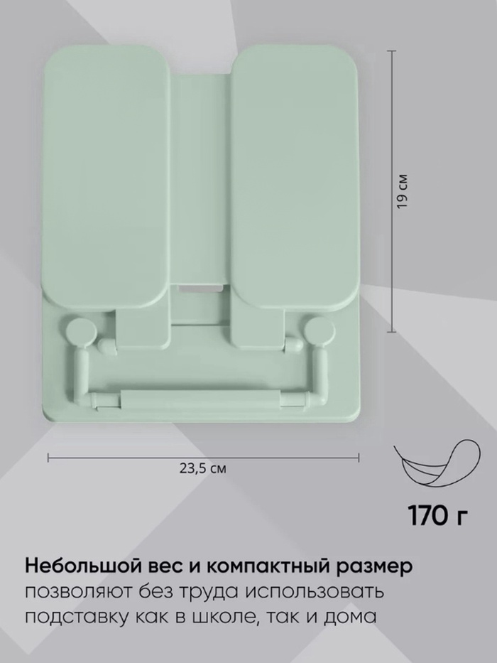 Пластиковая складная подставка с фиксатором. Семь углов наклона для расположения книги, что положительно влияет на осанку и зрение ребенка. Наличие держателей для надёжной фиксации страниц и может использоваться как закладка, а также двух по краям для пишущих принадлежностей. Ширина подставки — 235 мм, высота спинки — 190 мм.