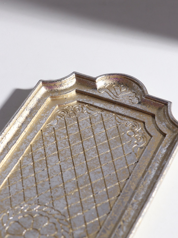 Эта декоративная подставка для мелочей — элегантный способ навести порядок и добавить в интерьер ноту изящества. Её вытянутая фигурная форма напоминает стилизованный лепесток или лист, а благородное золото с эффектом старинной патины придаёт вещи характер и глубину. Она создана, чтобы аккуратно хранить то, что всегда должно быть под рукой: ключи, бижутерию, письменные принадлежности или парфюм, превращая обыденные предметы в элемент декора.