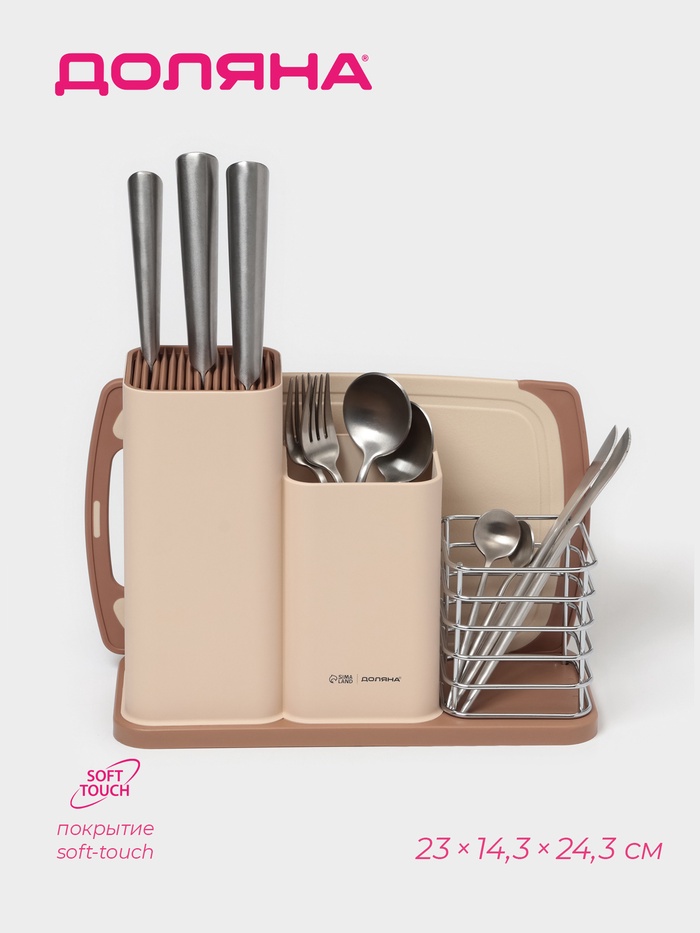 - Удобная организация: Разделители внутри подставки позволяют аккуратно и безопасно хранить ножи, вилки, ложки и другие столовые приборы.