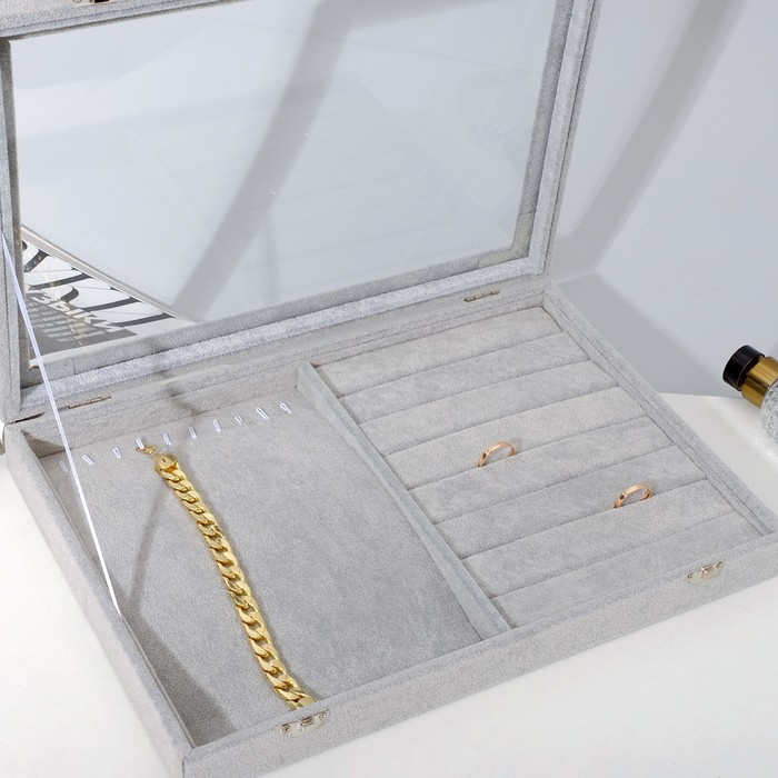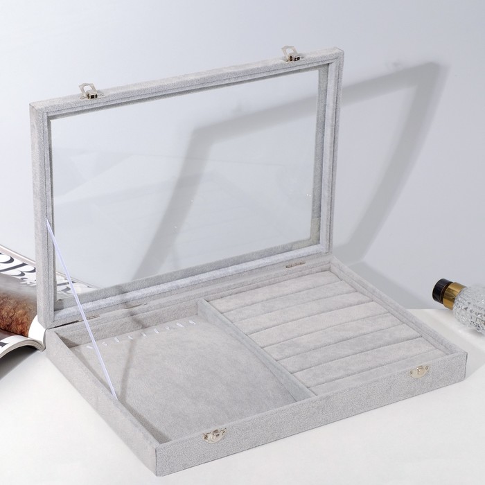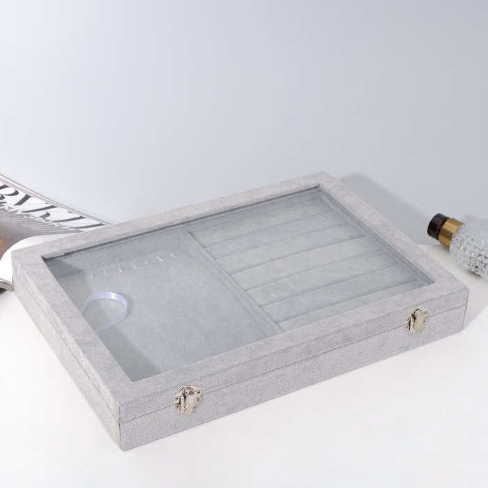 Подставка для украшений "Шкатулка" 10 крюч и 7 пол, 35*24*5, стеклянная крышка, цвет серый