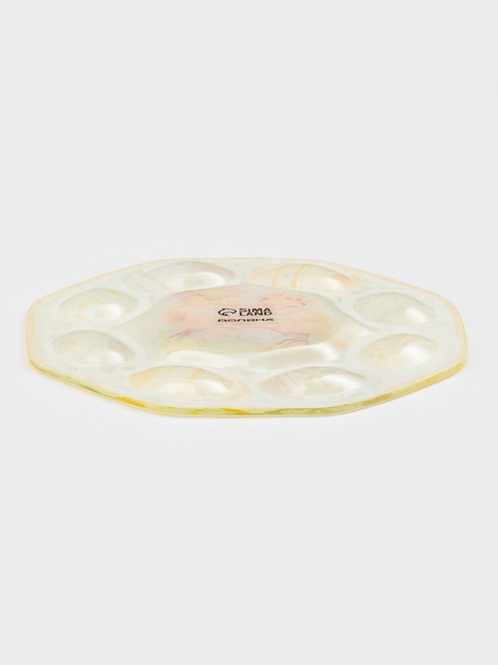 Эта подставка для яиц станет прекрасным дополнением вашего пасхального стола. Изготовленная из стекла, она имеет размеры 22×22×1 см и вмещает 8 яиц, что идеально подходит для праздничной сервировки. Желтый цвет и милые цыплята на рисунке создают радостное и праздничное настроение.