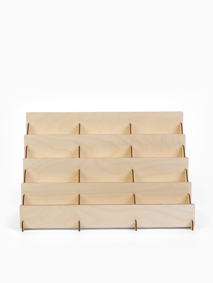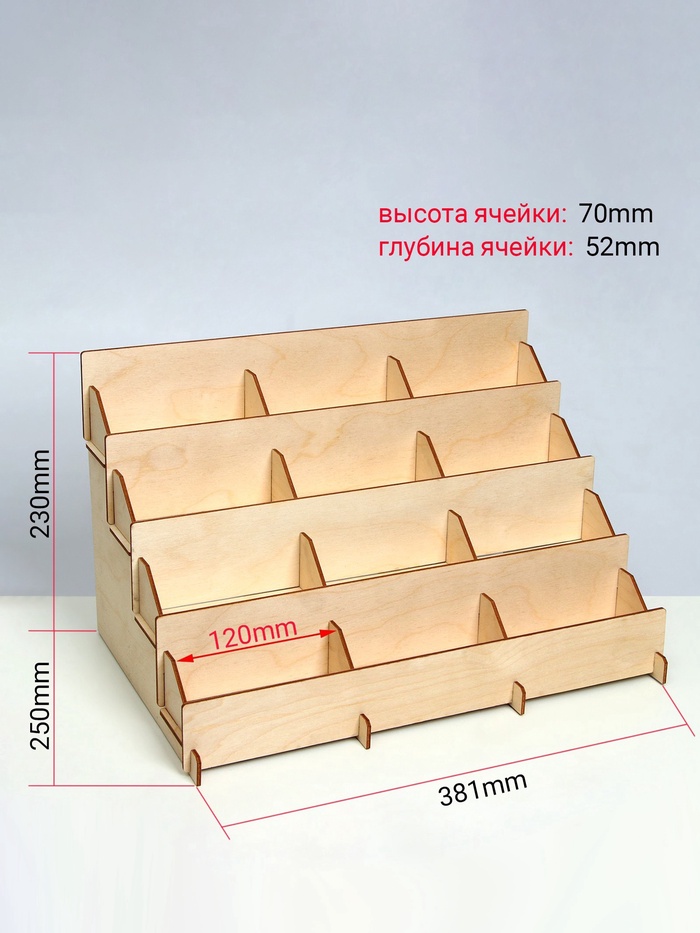 Настольная подставка для открыток с 12 ячейками — это удобное решение для организации и демонстрации карточек формата А6+. Размеры 38,1×23×25 см позволяют разместить коллекцию открыток или рекламных материалов в аккуратном порядке. Изготовленная из фанеры толщиной 3 мм в бежевом цвете, она сочетает практичность с эстетикой, создавая гармонию в любом интерьере.