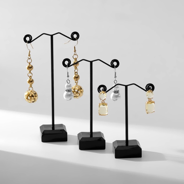 Подставка под серьги «Акрил», набор 3 шт, высота 8, 10 и 12 см, цвет чёрный — это элегантное и практичное решение для хранения и демонстрации серёг. В комплекте три подставки разной высоты, что позволяет удобно организовать украшения разных размеров и форм. Чёрный цвет придаёт подставкам стильный и современный вид, идеально подходящий для любого интерьера.