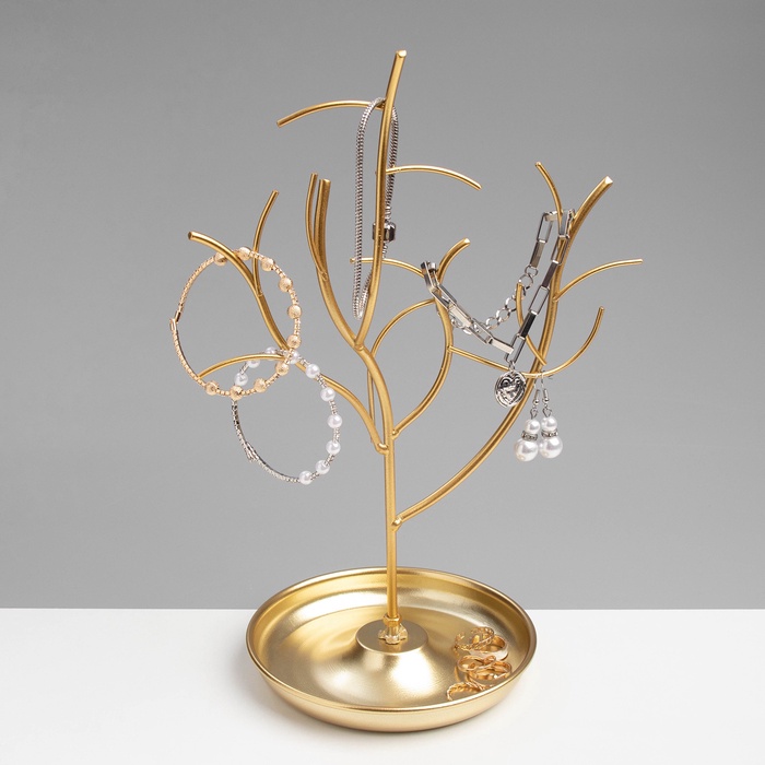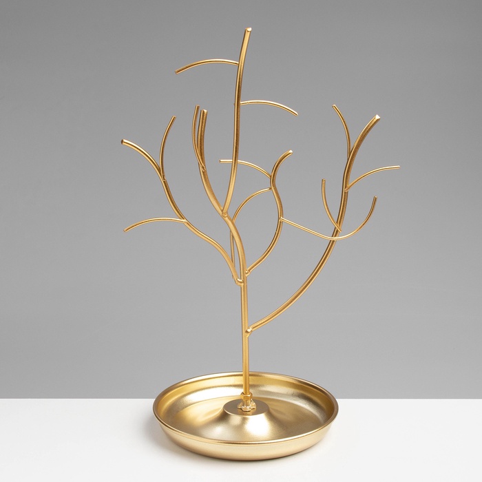 Подставка в форме дерева с золотистым металлическим покрытием — это гармоничное сочетание функциональности и изящества, которое станет настоящей находкой для хранения украшений. Высота 29 см и основа разного размера (микс) обеспечивают удобство размещения различных аксессуаров, от колец и серёжек до браслетов и цепочек.