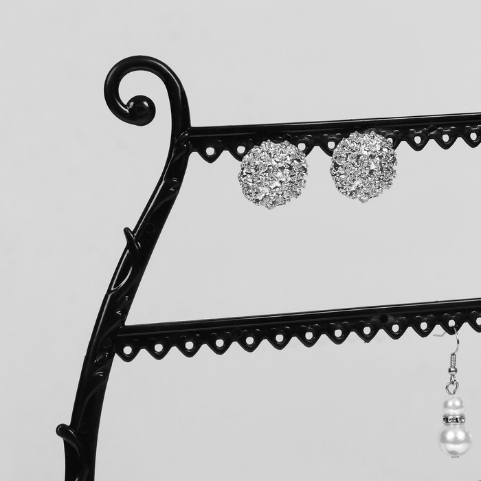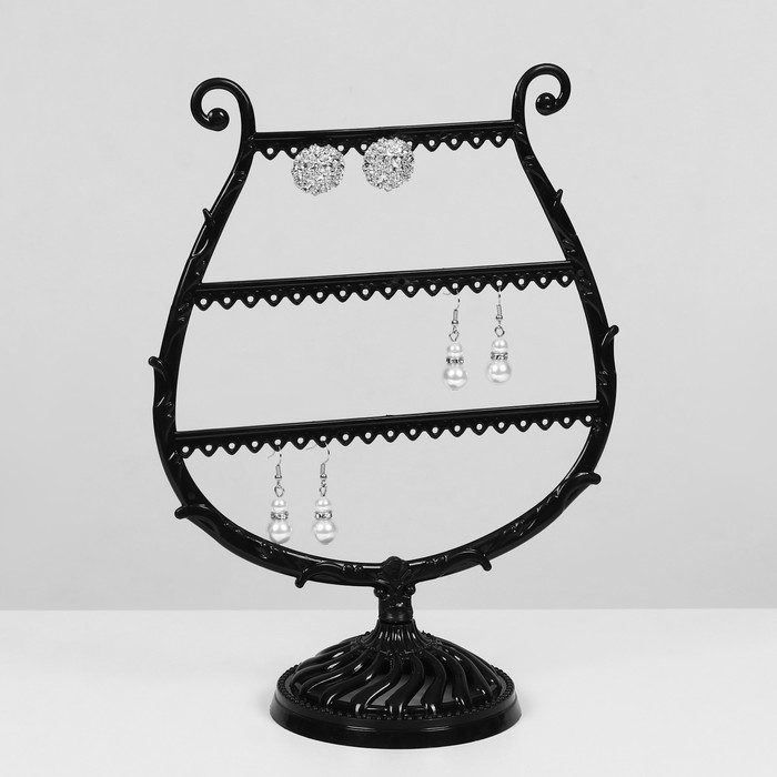 Черная универсальная подставка в форме арфы — продуманное решение для хранения и демонстрации украшений. Вместимость на 23 места позволяет удобно разместить серьги и другие мелкие аксессуары, обеспечивая порядок и быстрый доступ к любимым изделиям.