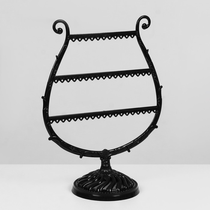 Изготовленная из прочного пластика, подставка сочетает в себе легкость и надежность. Ее строгий черный цвет придает аксессуару современный и стильный вид, который гармонично впишется в любой интерьер, подчеркивая красоту украшений и делая их центральным элементом вашего пространства.