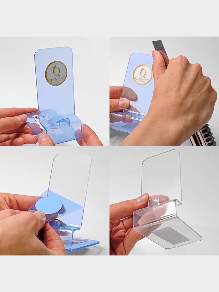 Универсальная сборная подставка под товар идеальна для смартфонов, планшетов, электронных и печатных книг. Применяется в салонах сотовой связи, магазинах электроники и книжных магазинах. Регулируется под разную толщину товара. На переднем крае подставки находится встроенный ценникодержатель. Поставляется в разобранном виде, легко собирается.