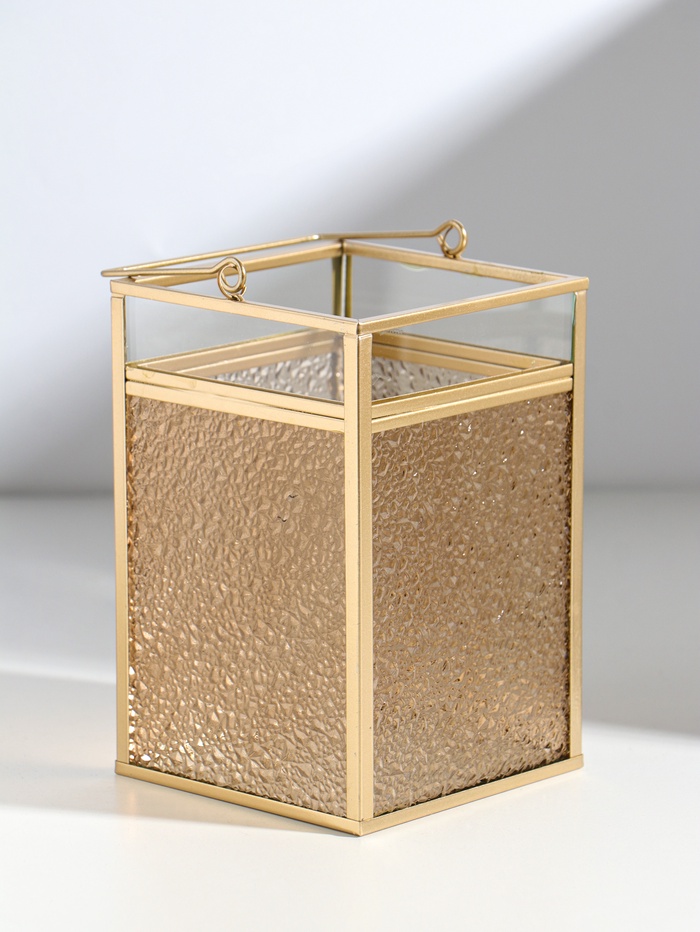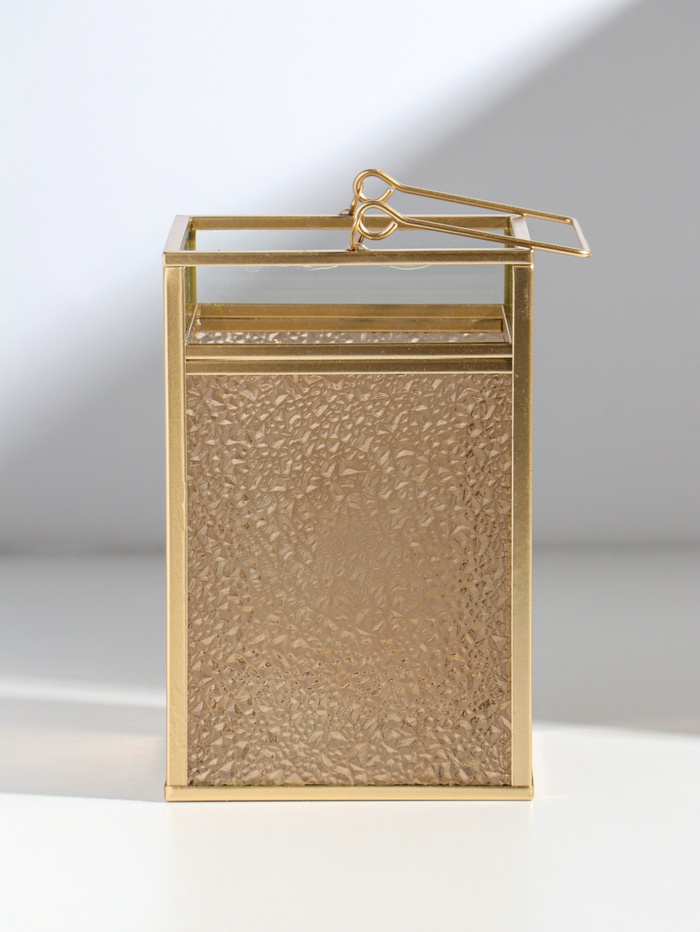 Этот золотистый фонарь-подсвечник создаёт атмосферу уюта и торжества в любом пространстве. Его декор напоминающие застывшие капли, преломляет свет свечи, наполняя комнату тёплым, живым сиянием. Удобная ручка делает его мобильным акцентом — вы легко перенесёте мягкое свечение из столовой на террасу или в спальню.