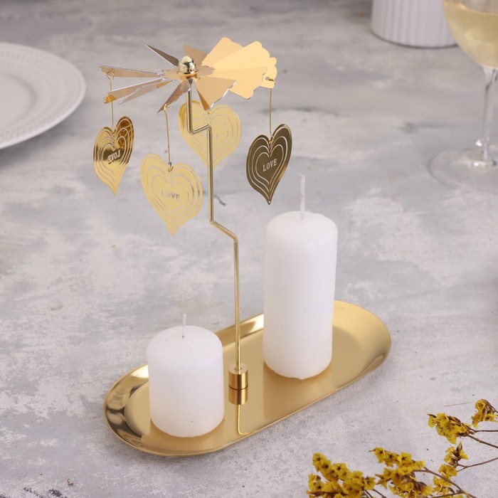 Вращающийся подсвечник от свечи, вдохновленный волшебными мелочами из сказок, мягко крутится вокруг своей оси, словно маленький мир, освещенный нежным сиянием свечи. Основание подсвечника выполнено из искусно выкованного металла, украшенного изящными фигурками. В центре подсвечника установлена тонкая металлическая ось, на которую аккуратно насажен сам подсвечник.