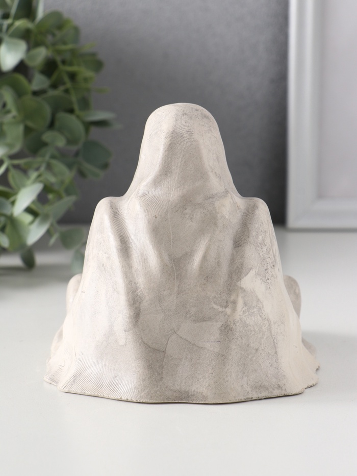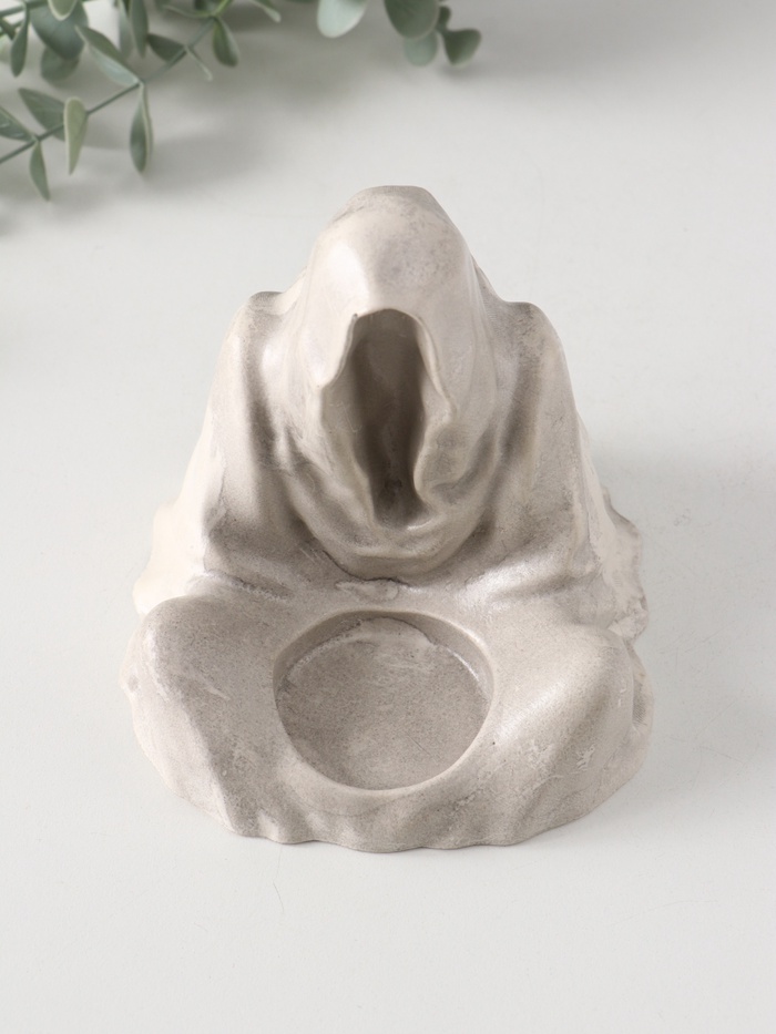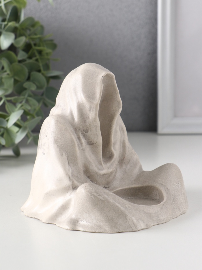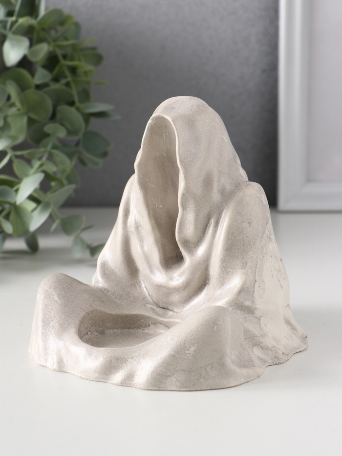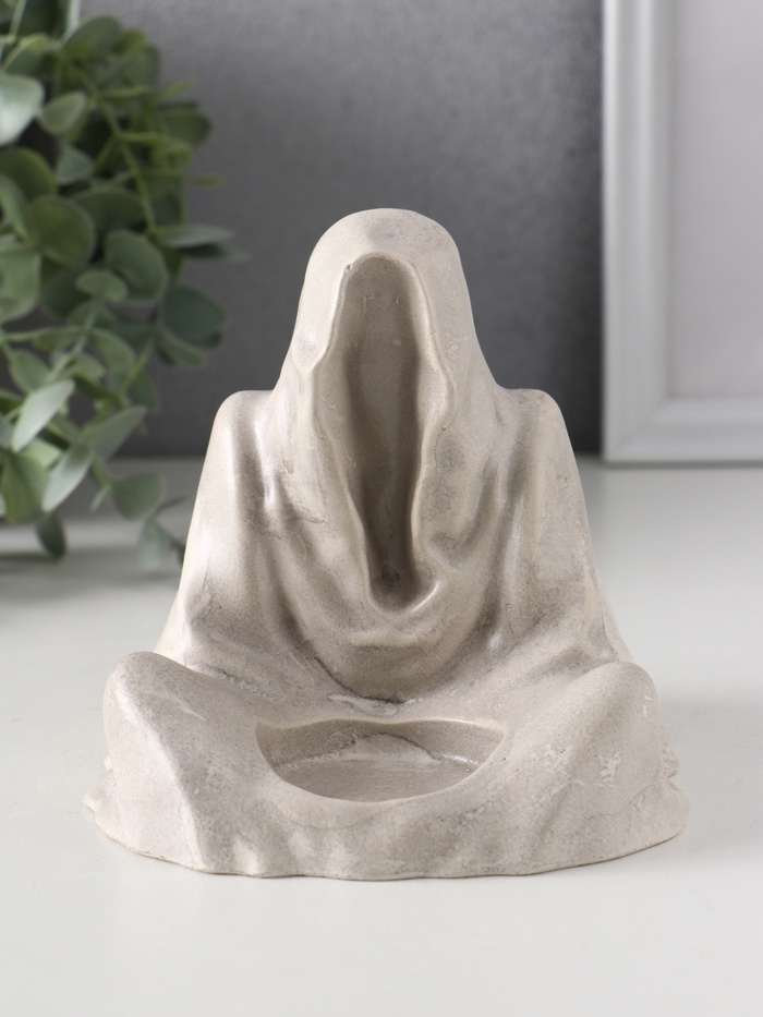 Глубокий оттенок серого и уникальная текстура гипса поглощают и мягко рассеивают свет, создавая таинственную и умиротворяющую атмосферу. Этот предмет — больше, чем аксессуар; это инструмент для медитации и создания особого настроения в вечерние часы. Его аскетичный дизайн делает его уместным как в повседневной обстановке, так и в тематическом декоре.