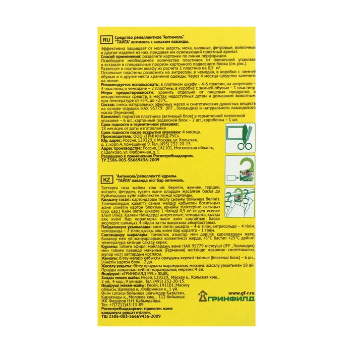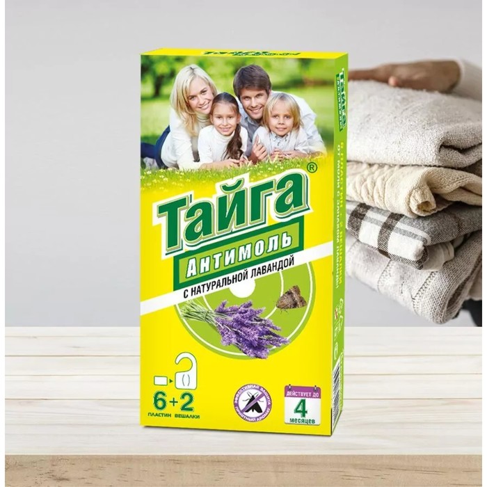 Описание Тайга Антимоль (подвесной блок) – продукт российской корпорации, производящей на собственном оборудовании моюще-дезинфицирующие средства, бытовую химию, инсектициды. Продукция компании ориентирована на широкий круг потребителей. Под брендом Тайга выпускается средства, предназначенные для борьбы с насекомыми, репелленты, акарицидные препараты. В мягкой упаковке Тайга Антимоль содержится 2 вешалки и 6 пластин. Происходит распространение запаха смеси натуральных и синтетических веществ, отпугивающих имаго (взрослых особей) моли. Контейнеры удобны для использования в местах хранения верхней одежды.Состав:смесь природных эфирных масел;синтетические душистые вещества на основе HAX 95779 (отдушки);сульфатная вискозная целлюлоза.Способ применения Начинать борьбу с молью следует с обнаружения места ее обитания. Блоки Тайга Антимоль размещают в гардеробной, шкафу, на антресолях и других местах, где хранятся теплая одежда и обувь. Вещества, содержащегося в одной пластины, достаточно для защиты от моли объема 2м3. Одна пластина рассчитанная на использование в течение 6 месяцев, практически обеспечивает защиту от моли на весь период хранения одежды между сезонами.
