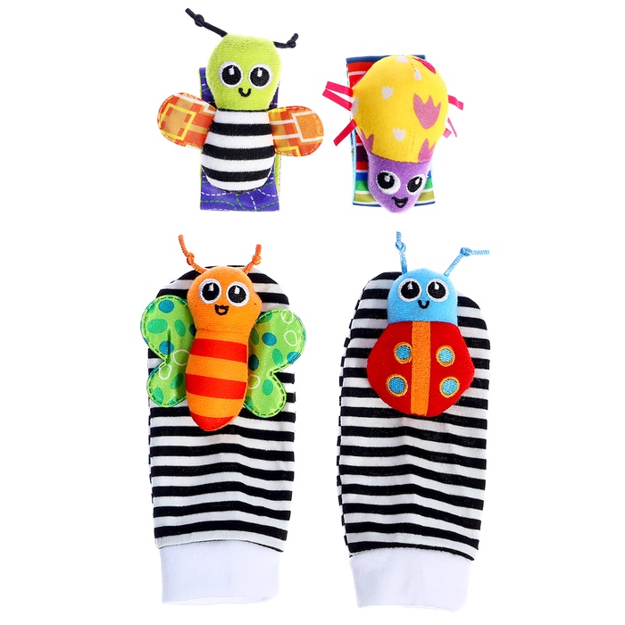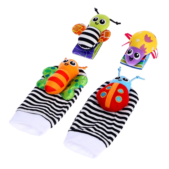 Набор погремушек для малышей — это текстильные аксессуары, которые помогут превратить первые месяцы жизни ребёнка в увлекательное исследование мира. В комплект входят четыре изделия: два носочка и два браслетика, которые легко крепятся на ручки и ножки малыша. Такие игрушки стимулируют развитие слуха, зрения и мелкой моторики с самого рождения.