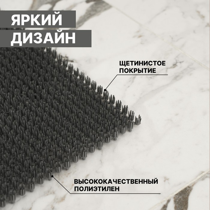 Множество упругих щетинок различной степени жёсткости располагаются на разной высоте. Проходя по ним, человек автоматически счищает грязь с подошвы, оставляя её на коврике. Затем сухие фракции проваливаются сквозь решётчатую структуру изделия и остаются на полу до момента уборки. Высота коврика позволяет принимать достаточное количество грязи.