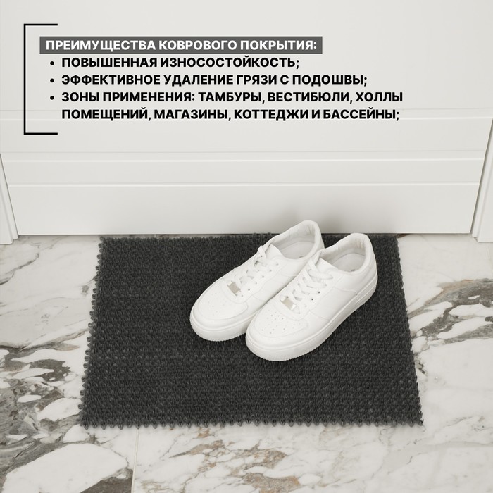 Грязезащитный коврик представляют собой прямоугольный модуль из экологически чистого, безвредного и высококачественного полиэтилена. Изделие предназначено для эффективного удаления грязи с подошвы проходящего человека.