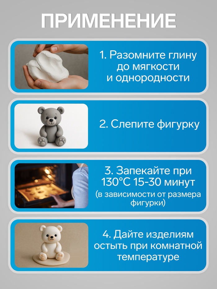 Идеально подходит для лепки небольших изделий (украшений, скульптурок, кукол) и для моделирования.Глина обладает отличными пластичными свойствами, хорошо размягчается и лепится, легко смешивается между собой, благодаря чему можно создать огромное количество поделок любых цветов и оттенков.Блок поделен на сегменты, что позволяет легче разделять глину на порции.В домашних условиях готовая поделка выпекается в духовом шкафу.Отвердевшие изделия могут быть раскрашены акриловыми красками, покрыты лаком, склеены друг с другом или с другими материалами.