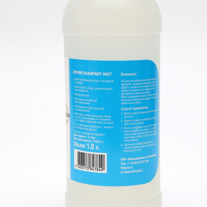 Способ применения: используйте специальный помповый дозатор. Наденьте шар на насадку дозатора как можно глубже. После попадания состава во внутреннюю часть шара, в течение нескольких секунд растирайте шар ладонями, чтобы состав покрыл всю поверхность. Заполните обработанный шар гелием. Дайте шару высохнуть как минимум 2 часа.