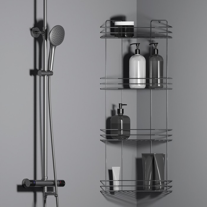 Угловая 4-х ярусная полка — удобный и вместительный аксессуар для ванной комнаты. Подходит для хранения небольших полотенец, косметических и хозяйственных средств.