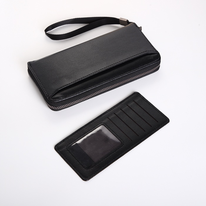 Этот чёрный клатч с молнией создаёт универсальное решение для повседневных платежей. Единое отделение объединяет банкноты и карты в организованном пространстве. Молния по периметру защищает содержимое, сохраняя минималистичный профиль аксессуара. Классический цвет сочетается с деловым и casual-гардеробом.