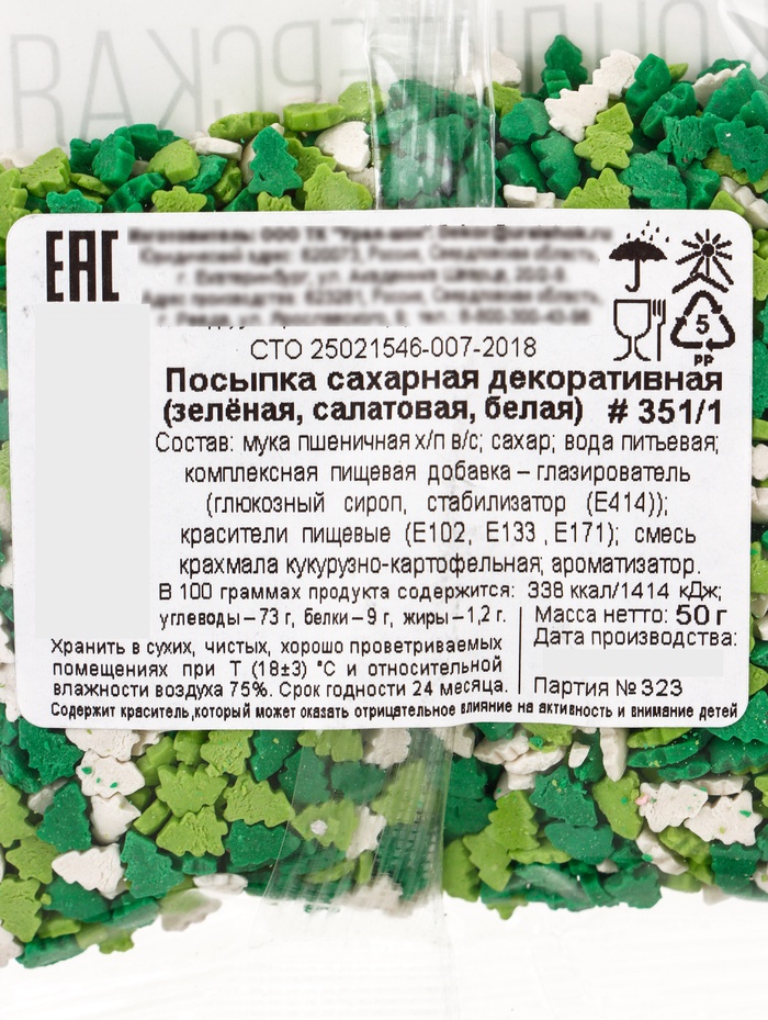 Посыпка кондитерская «Ёлочки», белые, зеленые, салатовые, новогодняя, 50 г