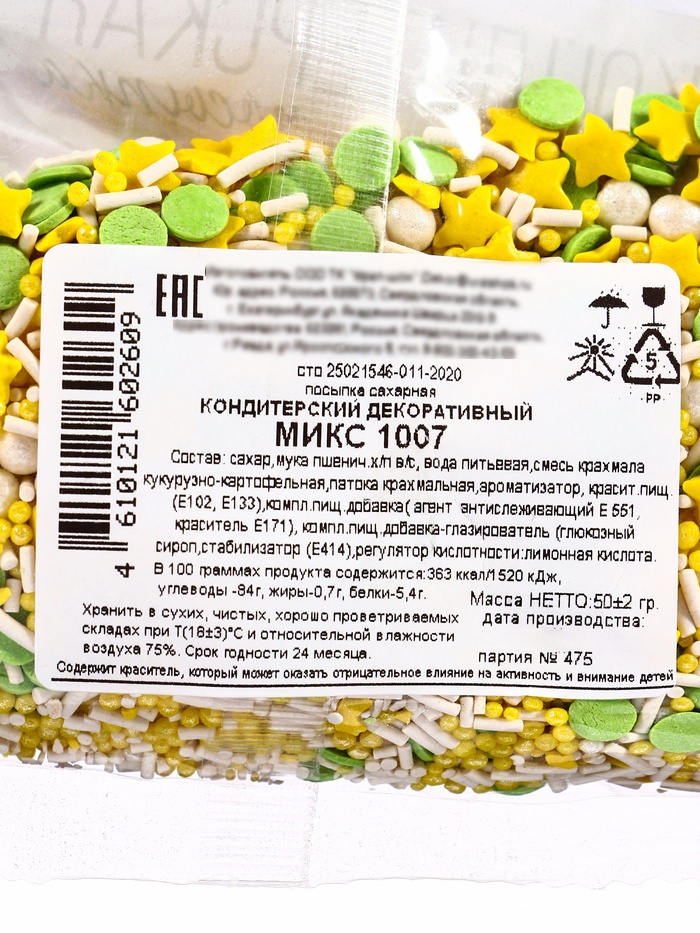 Посыпка кондитерская «Микс»: зеленый, желтый, белый, 50 г