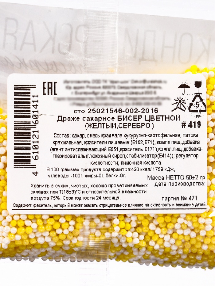 Посыпка кондитерская с мягким центром «Бисер» цветной «желтый, серебро», 50 г