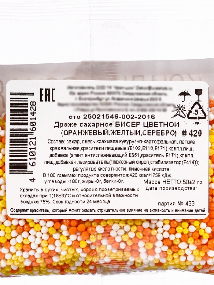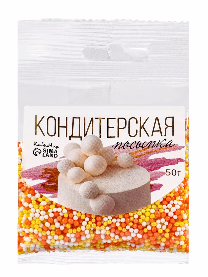 Посыпка кондитерская с мягким центром «Бисер»: желтый, оранжевый, серебро, 50 г