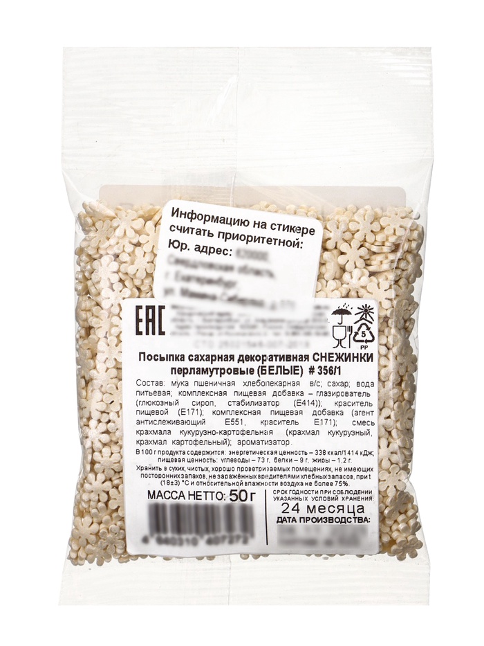 Добавьте волшебства и зимнего сияния вашим десертам с помощью этой нежной кондитерской посыпки. Белоснежные перламутровые снежинки создадут ощущение лёгкого морозного узора на поверхности тортов, кексов и печенья. Они помогут превратить любую домашнюю выпечку в праздничный десерт, который восхитит и детей, и взрослых.