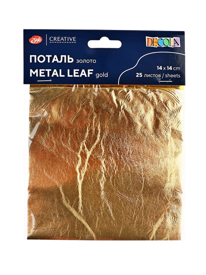 Поталь листовая в книжке. Благодаря размещению листов потали в книжке, работать с ней удобно. В этом случае художнику не нужна специальная кисть-лампензель для переноса листа на рабочую поверхность. Лист берется вместе с бумагой, обрезается при необходимости ножницами и переносится на объект. Состав: 86% медь, 14% цинк. Толщина листа 0,03 микрон.