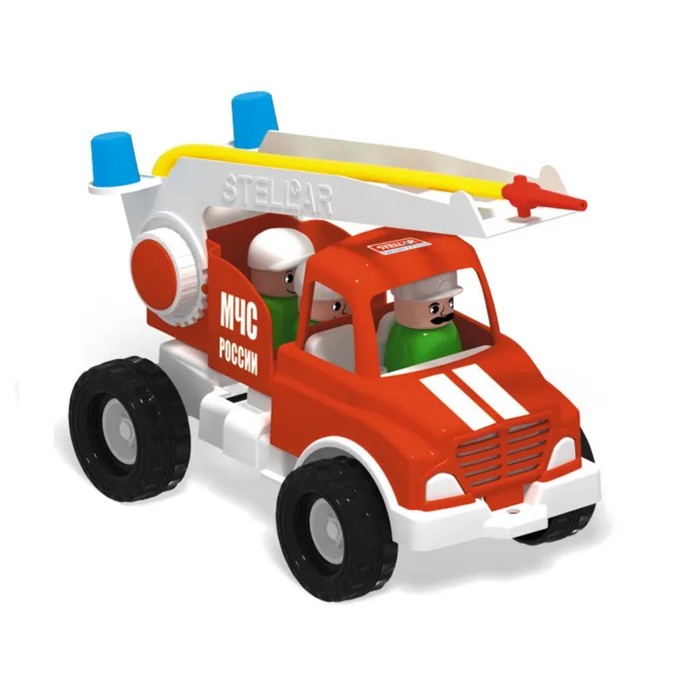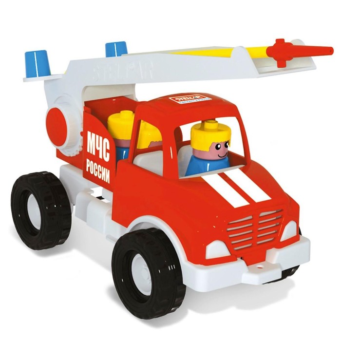 - В кабине и кузове машины могут ехать три маленьких пожарных, которых можно вынимать.