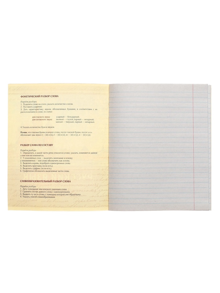 Все необходимые правила орфографии и пунктуации собраны в одном месте — вам не нужно перелистывать учебник во время выполнения упражнений. Четкие линии помогают аккуратно оформлять грамматические разборы и синтаксические схемы. Тетрадь полностью раскрывается, обеспечивая удобство при работе с объемными заданиями и написании диктантов.