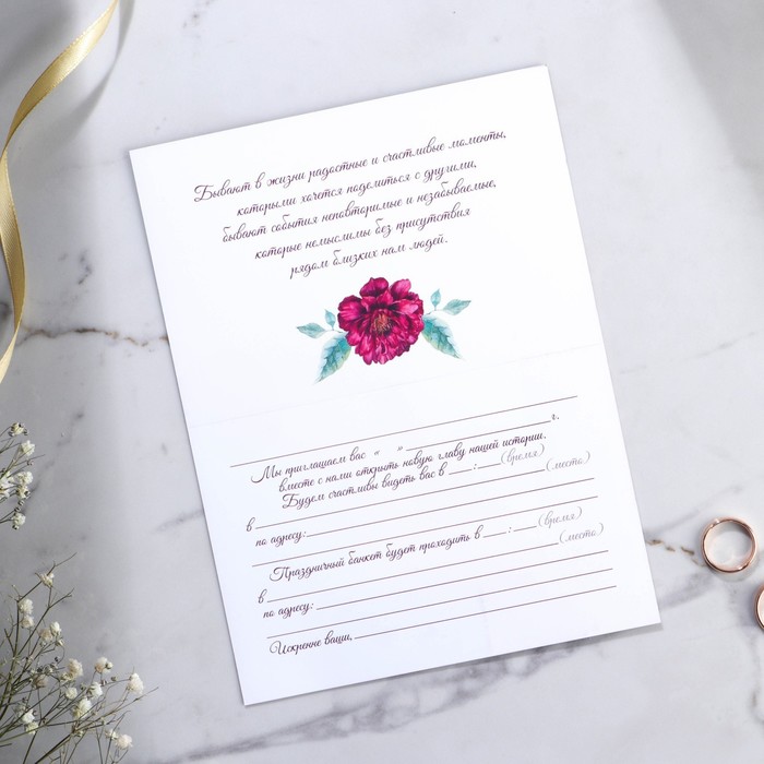 Когда дата и время бракосочетания уже известны, и вы определились со списком гостей, необходимо оповестить их о предстоящем празднике. Существует традиция делать персональные приглашения с указанием времени и даты мероприятия. Но перед свадьбой столько всего надо успеть, что на изготовление десятков открыток просто не остаётся времени. В этом случае вам придёт на помощь уникальное приглашение. Изделие выполнено из картона плотностью 250 грамм и дополненено крафтовым конвертом с наклейкой из самоклеющейся бумаги.. Это придаёт дорогой и роскошный вид. Текст приглашения содержит свободные поля для имени адресата, времени, даты и адреса проведения мероприятия. Это потрясающее приглашение достойно стать частью такого важного события в жизни, как свадьба!