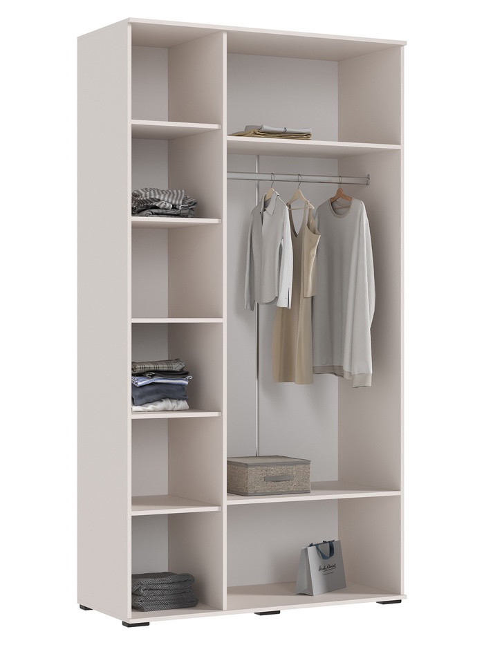 Шкаф оснащён шариковыми направляющими для лёгкого открывания дверей, накладными петлями и угловыми навесами с заглушками. Трёхрожковый крючок и опоры обеспечивают удобство использования и устойчивость конструкции.