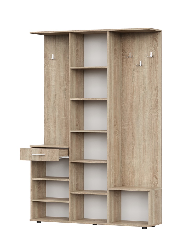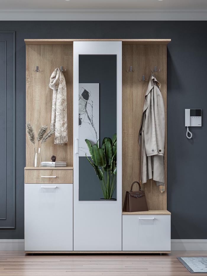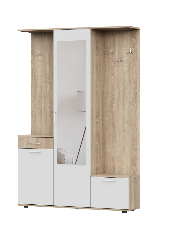 Стильная и функциональная прихожая «ПР1» станет практичным решением для современного интерьера. Компактная конструкция сочетает открытые и закрытые секции, позволяя удобно разместить верхнюю одежду, обувь и аксессуары. Контрастная комбинация дуба сонома и белого цвета придаёт модели лёгкость и визуально расширяет пространство.