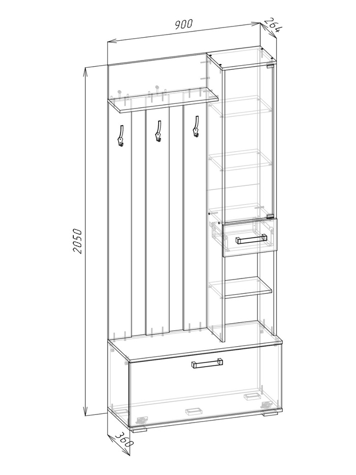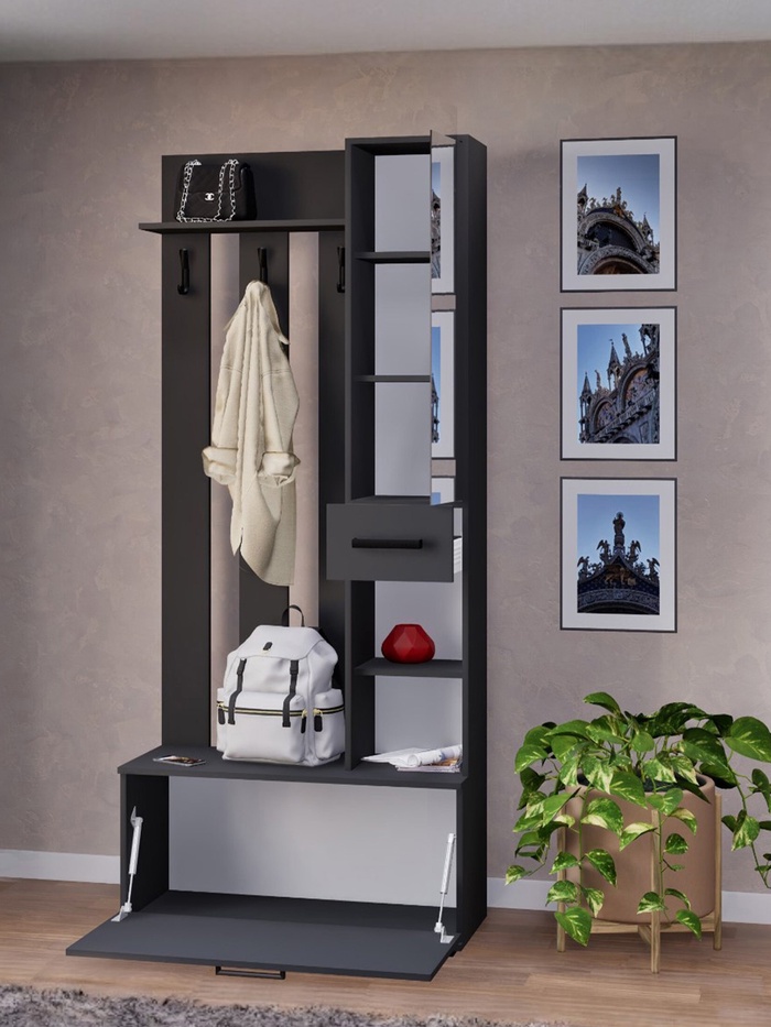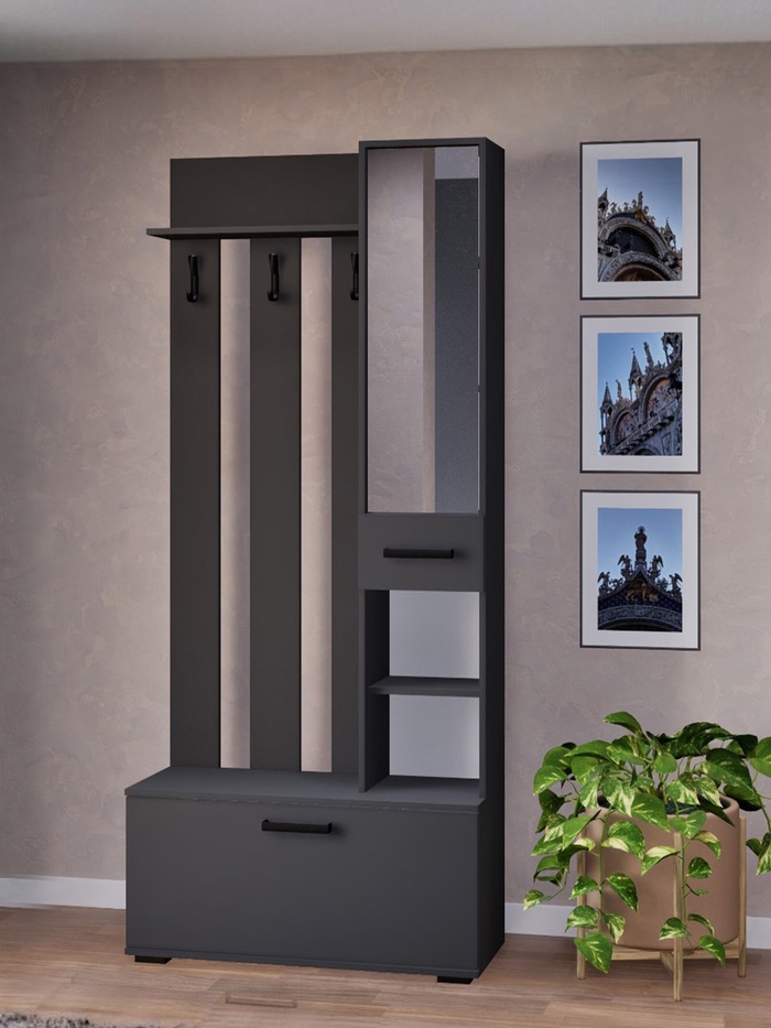 Компактная, но продуманная модель оптимально организует пространство вашей прихожей. Помимо классического функционала (место для верхней одежды и обуви), здесь предусмотрено специальное отделение для головных уборов и мелких деталей гардероба.