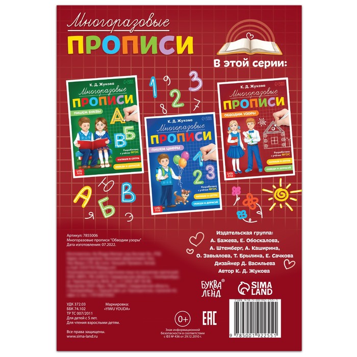 Многоразовые прописи «Обводим узоры» — это уникальный инструмент для подготовки ребёнка к школе. 12 страниц с заданиями и маркер на водной основе помогают освоить письмо, развить мелкую моторику и сделать обучение увлекательным.