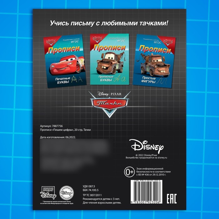 Прописи «Пишем цифры» с любимыми героями «Тачки» помогут ребёнку уверенно освоить написание цифр и подготовить руку к письму. С их помощью ученик не только научится правильно выводить цифры, но и разовьёт мелкую моторику, логическое мышление и внимание к деталям.