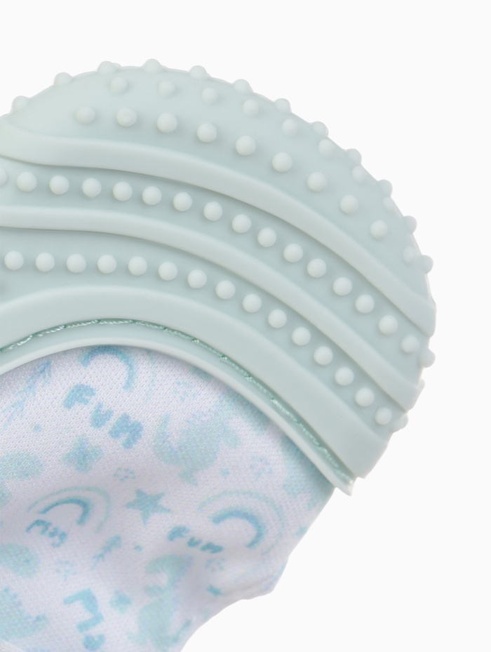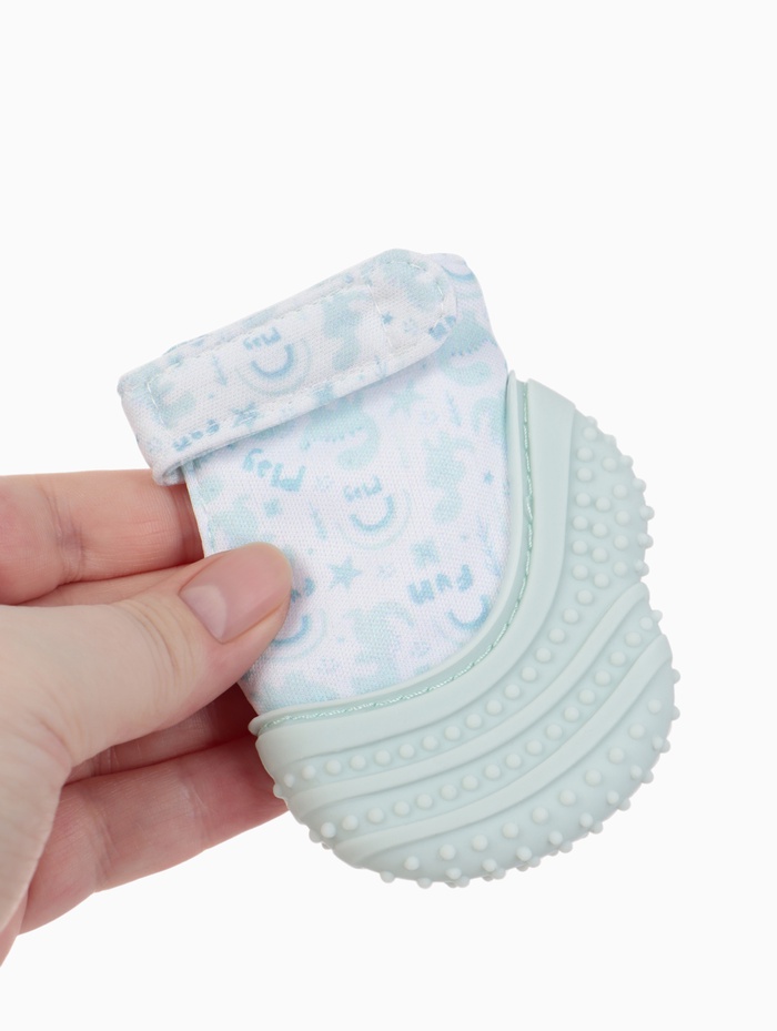 Мягкий силикон с рельефной поверхностью помогает бережно массировать дёсны и уменьшать дискомфорт. Текстильная часть приятно шуршит, привлекая внимание малыша и дополнительно вовлекая его в игру. Благодаря липучке варежка хорошо фиксируется на ручке и удобно надевается.