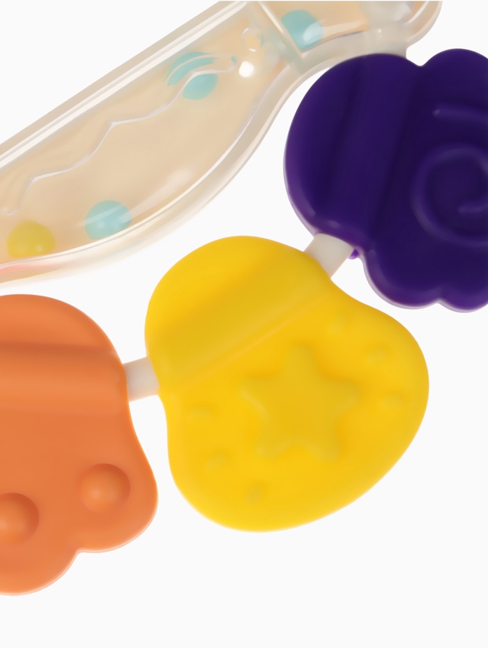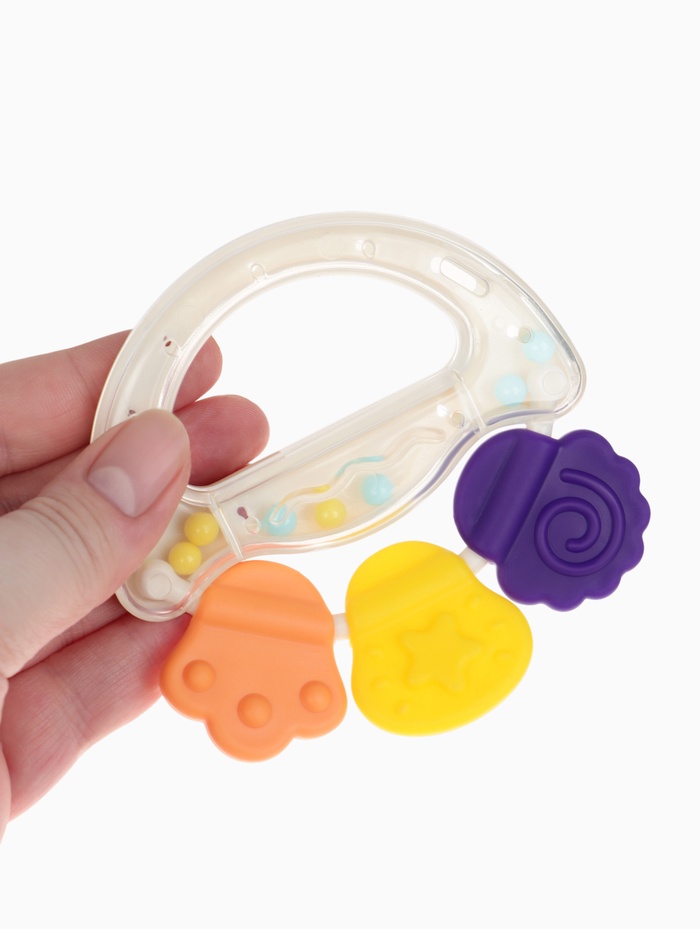 Изделие выполнено из безопасного пищевого силикона, который можно грызть и даже кипятить для стерилизации. Рельефные элементы помогают бережно массировать дёсны, снижая дискомфорт, а встроенные шарики создают мягкий и приятный звук при движении.