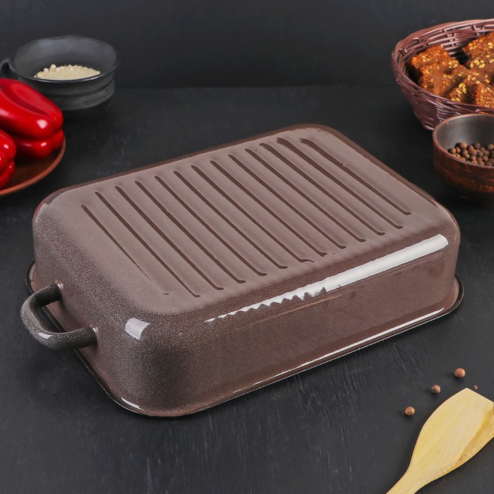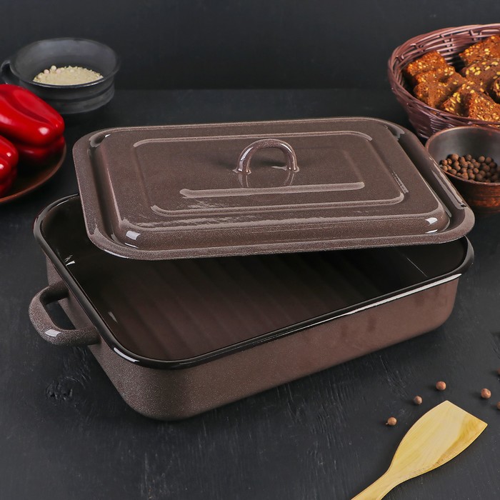 Эмалированная посуда соответствует и производится строго по стандартам ГОСТ 24788-2018. Стальной эмалированный противень производится из высококачественного металла, покрытого двумя слоями жаропрочной эмали. Для производства противня с крышкой используются экологически чистые цветные эмали, обеспечивающие высокую коррозийную стойкость.