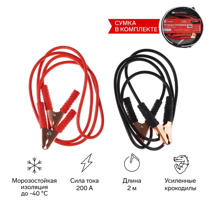 Стартовые провода (провода прикуривания) предназначены, для соединения одноименных клемм аккумуляторов автомобилей, чтобы осуществить дополнительную подпитку стартера в автомобиле с разряженной аккумуляторной батареей или загустевшим от мороза маслом. Стартовые провода для аккумулятора легки в использовании и имеют различные цвета (красный и черный) для обозначения положительного и отрицательного подключений. Морозостойкая гибкая полимерная изоляция проводов обеспечивает долговечность и прочность. Провода обладают хорошей гибкостью, что удобно при подключении к аккумулятору, а алюминиевый профиль с медным напылением обеспечивает надежное соединение проводов и клемм.