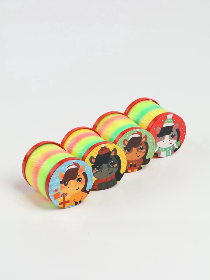 - Материал — пластик — прочный, лёгкий и нетоксичный. Пружинка не сломается при падении и подойдёт детям от 3 лет.