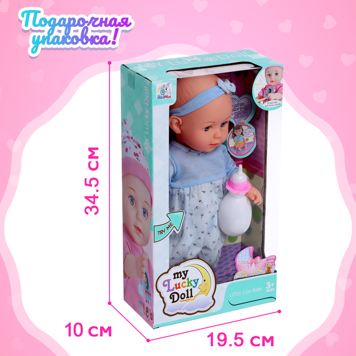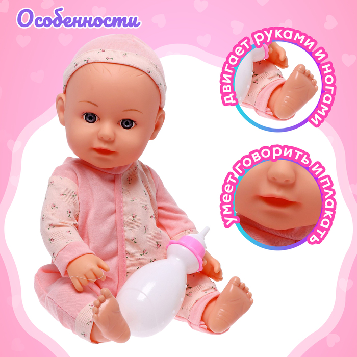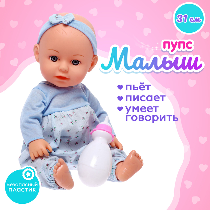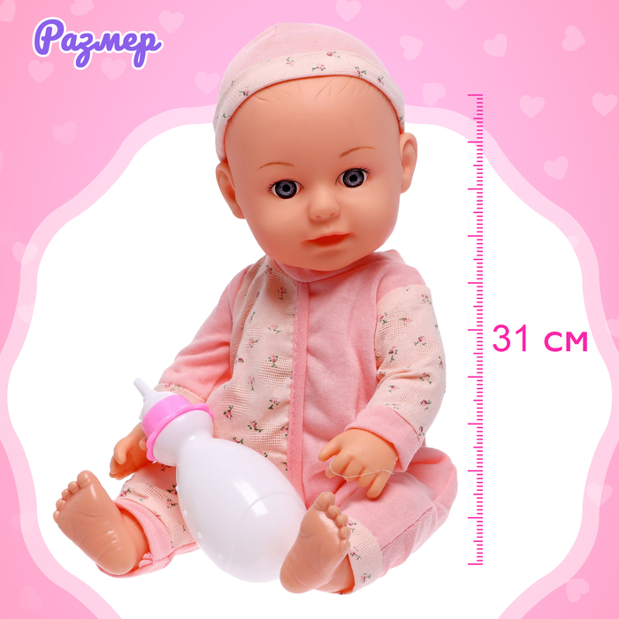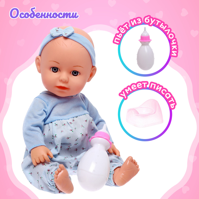 В наборе с пупсом представлена бутылочка. Аксессуар и кукла выполнены из пластика — безопасного материала для малыша.