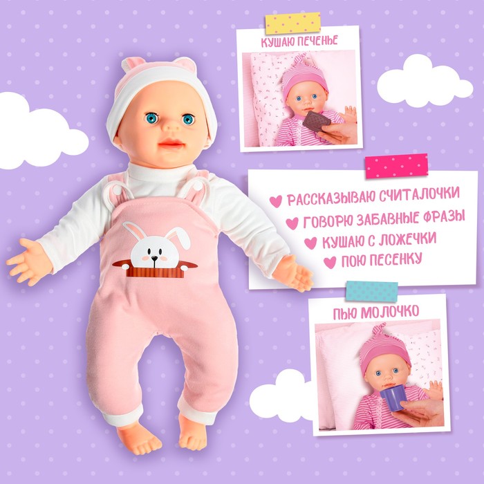 - Пупс ест с ложечки (причмокивает), пьёт (имитация, реагирует на кружечку), ест печенье (звук откусывания, если поднести печенье).