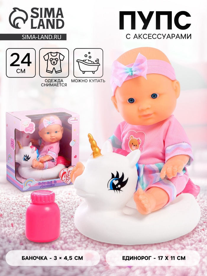 Пупс «Купание с единорогом» — это идеальный подарок для маленьких любителей водных забав. В комплекте идёт всё необходимое для весёлого купания: кукла, баночка и круг для купания в виде единорожки. Одежда пупса легко снимается, что делает игру ещё более увлекательной и разнообразной.