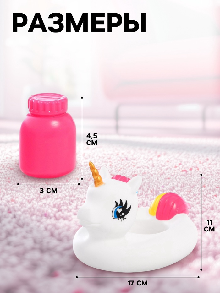 - В комплекте аксессуары для купания: баночка и круг-единорог.