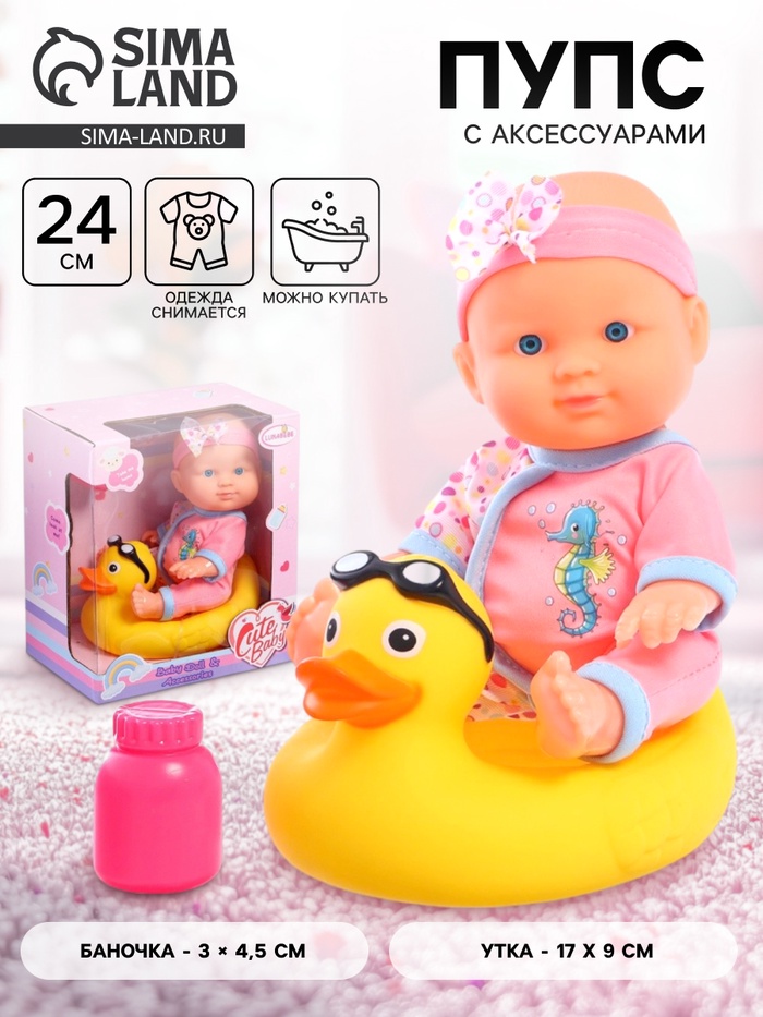 Пупс «Купание с уточкой» — это идеальный подарок для маленьких любителей водных забав. В комплекте идёт всё необходимое для весёлого купания: кукла, баночка и круг для купания в виде уточки. Одежда пупса легко снимается, что делает игру ещё более увлекательной и разнообразной.