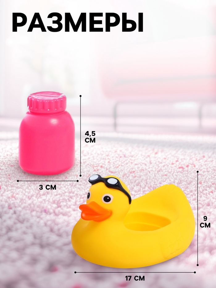 - В комплекте аксессуары для купания: баночка и круг-уточка.