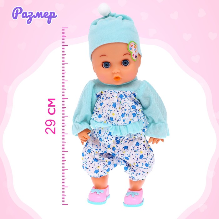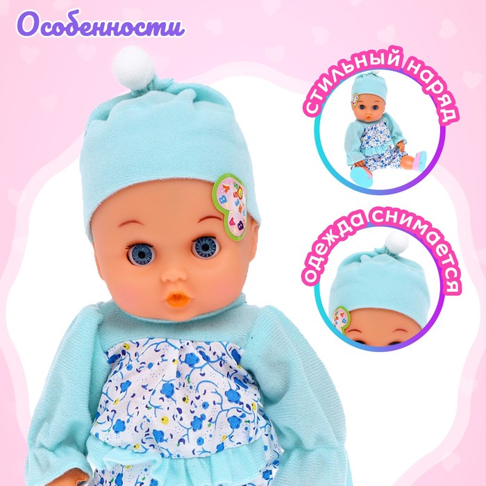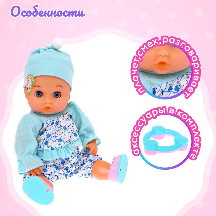 - Пупс издаёт звуки: смех, плач, говорит «мама» и «папа».